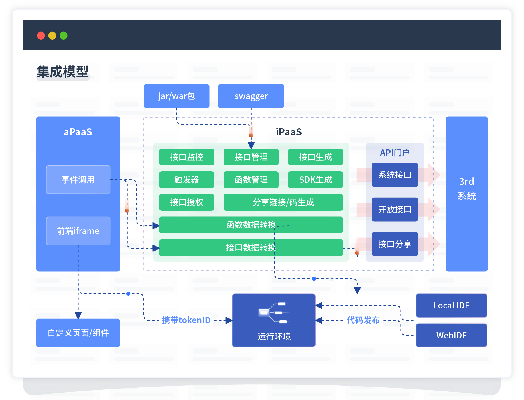 集成模型包括平台本身前、、、、、、、、、后端能力的扩展,,,,,,也支持通过API门户和第三方系统进行交互。。。。。。