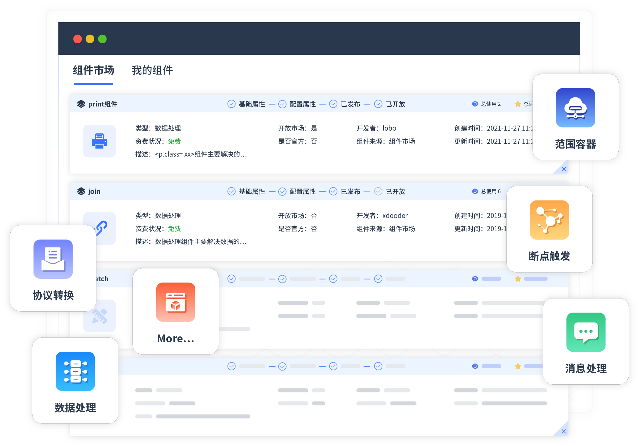 针对集成场景,,,,,,,,,VIVO钱包提供组件市场,,,,,,,例如协议转换、、、、、、、消息处理、、、、、、、、、、文件操作等。。。。。。。除平台提供的组件外,,,,客户可以自定义所需组件。。。。。。。。。。。。。