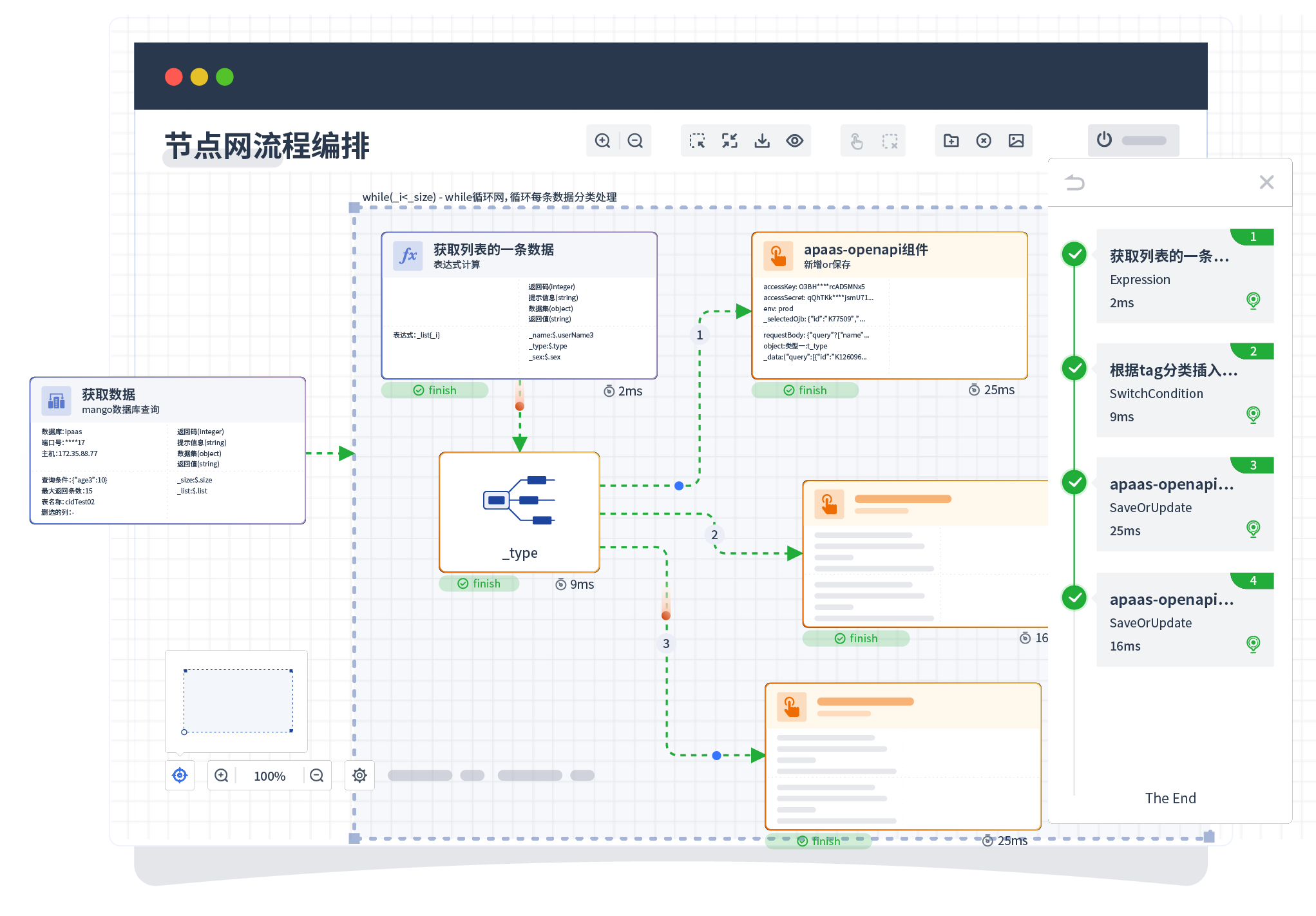 针对集成场景,,,,,,组件定义后支持进行流程编制,,,,,,,,,,,,,,不同于传统代码方式,,,,,,通过图形化展示,,,,,,,支持在线调试、、、、、、、、、、日志查看和运行回放。。。。。。。。。。。