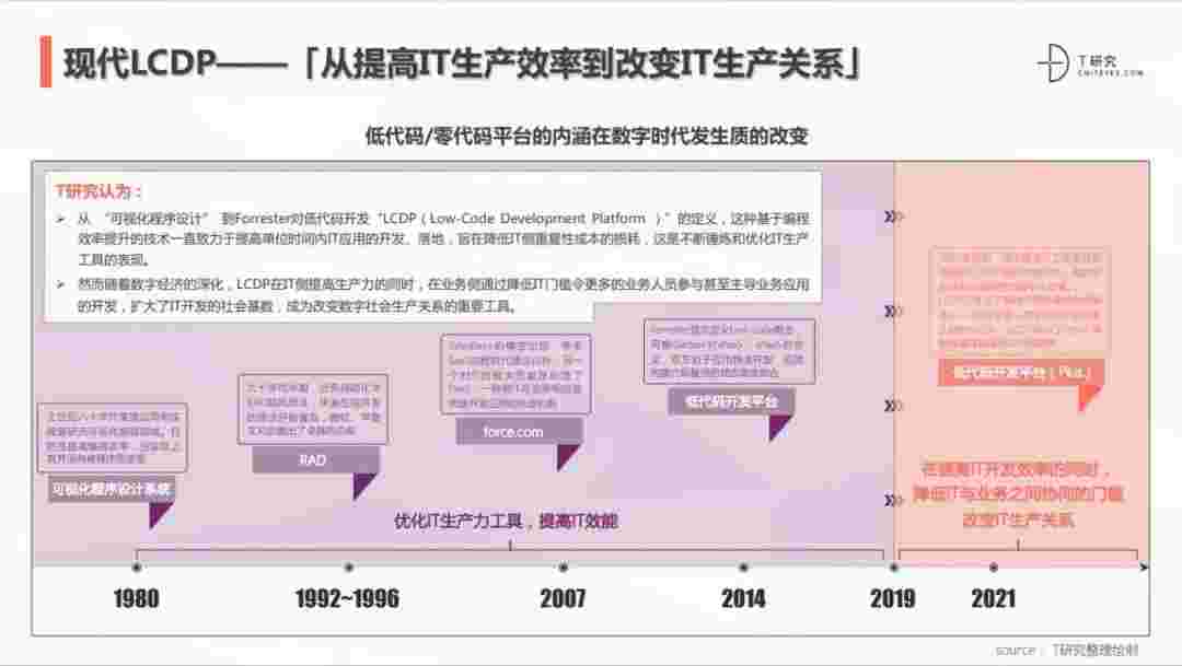 2020年前后,,,,,,源于提高IT工作者开发效能的LCDP不断进化和衍生,,,,,,,,,,,,,面对业务导向日益明显的数字化变革。。。。。。。。。。LCDP衍生出了面向不同对象的升级服务——面向专业人群的LCDP和业务人群的NCDP,,,,,LCDP与NCDP的不同服务属性被逐渐认可和接受。。。。。。。。 LCDP在提高IT开发效率的同时,,,,,,,,,,,,,,降低IT与业务之间协同的门槛改变IT生产关系。。。。。。
