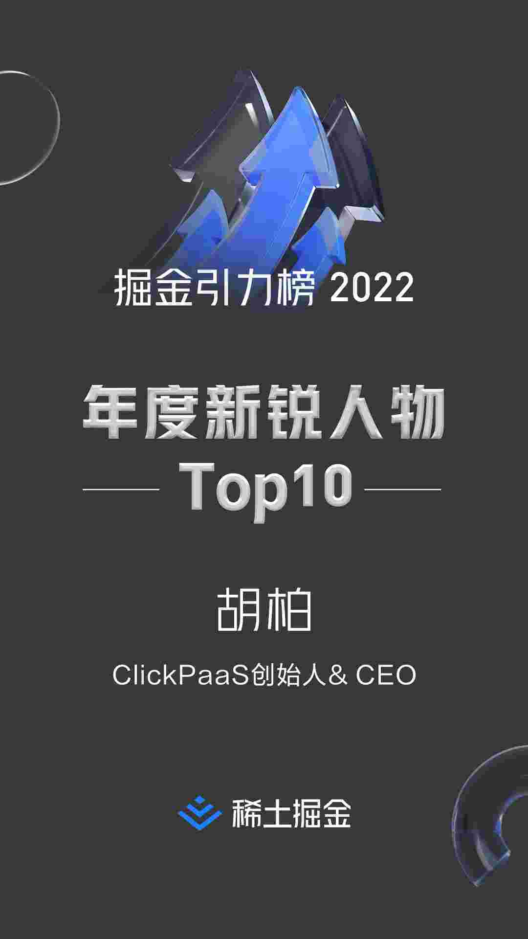 2022年1月6日,,,,,,,稀土掘金社区第一届「掘金未来大会」成功举办,,,,,,,,,,,,会上发布了“2022 稀土掘金引力榜 年度新锐人物”榜单,,,,,上海爱湃斯科技有限公司(简称VIVO钱包)创始人及CEO胡柏实力入选年度新锐人物TOP 10。。。。。。。。。。。。