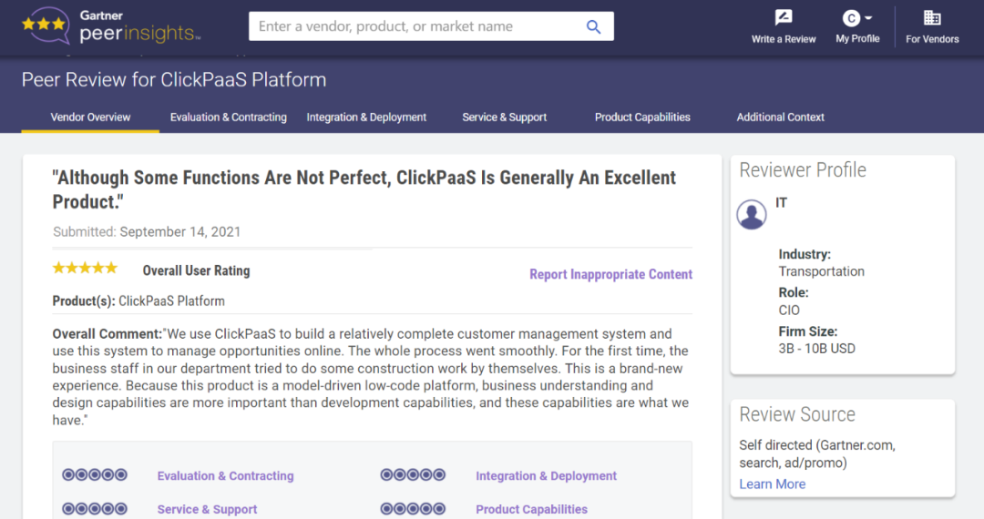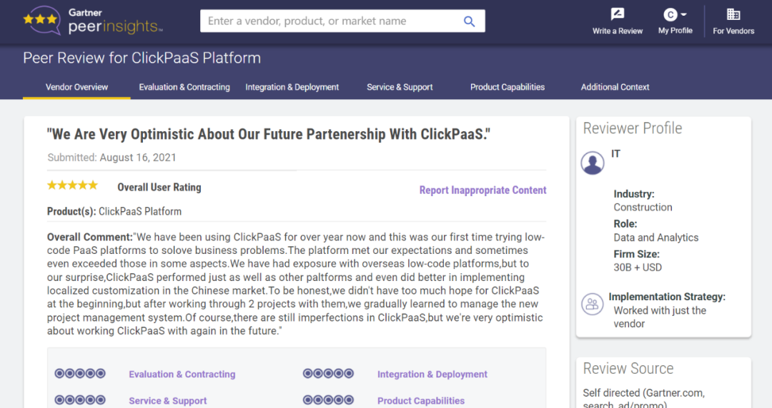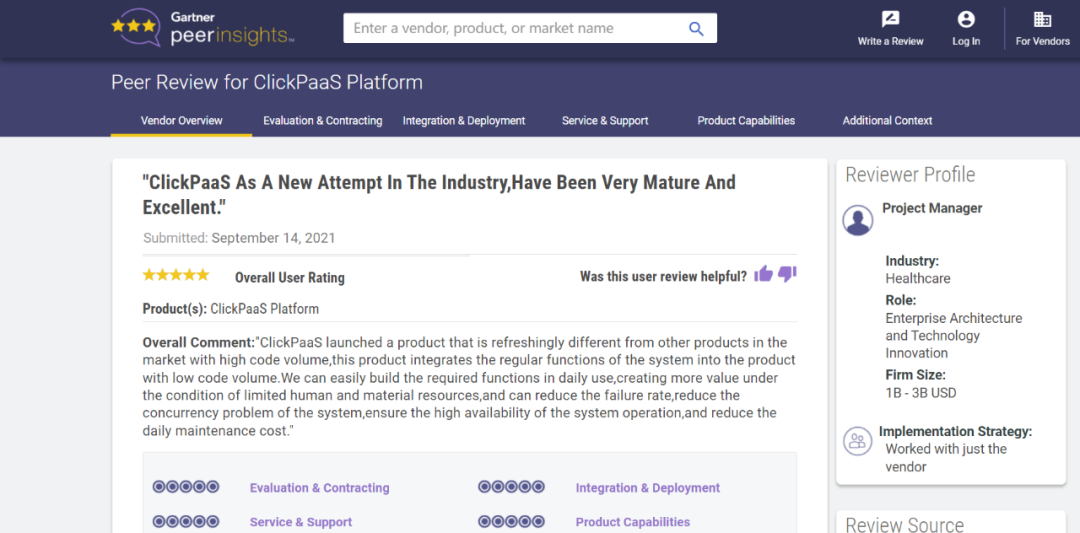 Tips:::::::::::【Peer Insights】——用户对企业IT产品和服务发布真实评价的平台。。。。。。。。。目前已有355个市场,,,,,,,255,000条经过验证的评价。。。。。。。每一条评价Gartner会针对参评企业营收规模及参评人员信息做验证、、、、、、、、评价内容做多维核实。。。。。。。。。。